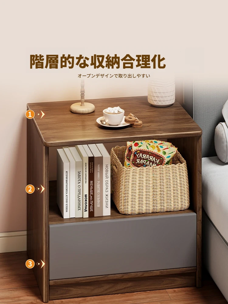 シンプルでモダンなデザイン!多機能収納ベッドサイドキャビネット - 寝室にぴったりのコンパクトな実木製収納ラック。おしゃれに整理整頓して、お部屋をスッキリと!
