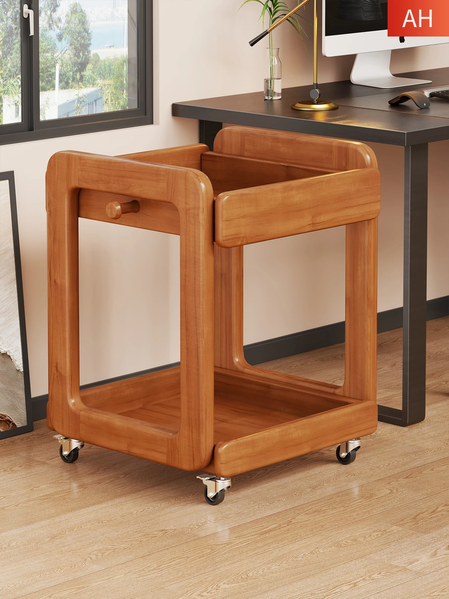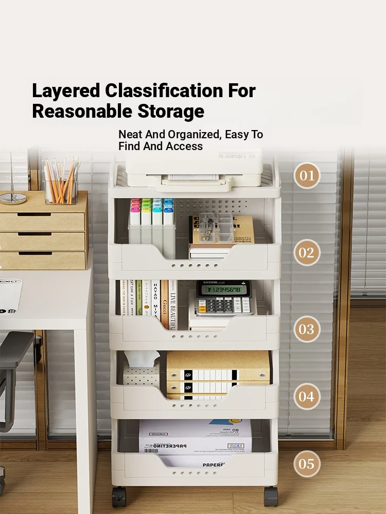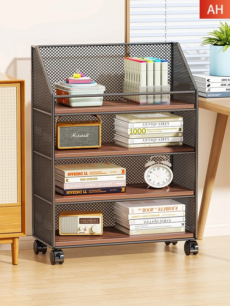Wooden Bookshelf on Wheels - Multi-Tiered Storage Cart for Home and Office, Perfect for Organizing Books, Bags, and Snacks Under Desks.