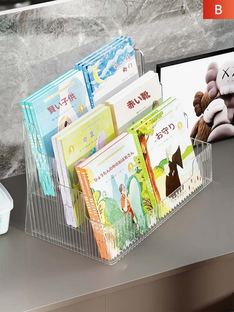 リビングにぴったり!透明な階段式の本棚 - シンプルなデザインで雑誌や絵本を美しく収納。子供たちの読み物を楽しく整理!